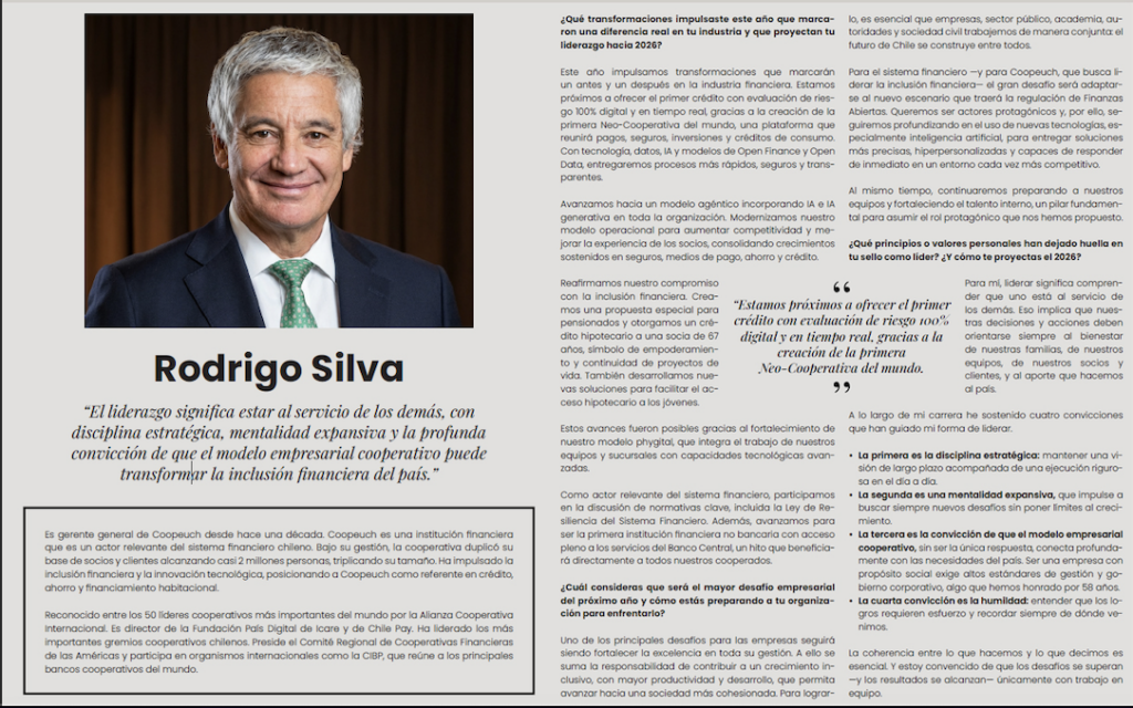 La edición especial de diciembre de la revista e-Negocios ha destacado al gerente general de Coopeuch, Rodrigo Silva Iñiguez como uno de los líderes que están transformando el rumbo empresarial del país. Este reconocimiento resalta su capacidad para combinar la excelencia estratégica con un profundo propósito humano y social.